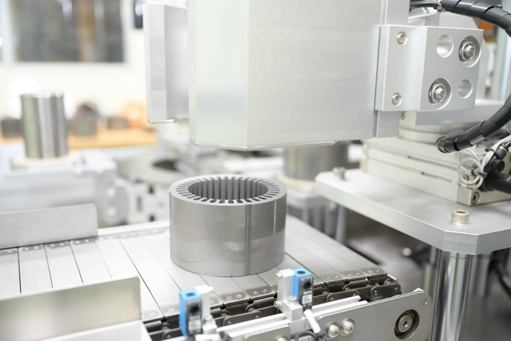此外,示範線擁有一座類似「迴轉壽司」的大型旋轉平台,平台上配置鐵芯生產所需的各製程站體,包括衝斷散片、自動疊片、精密測高、自動加壓、感應加熱、精準控溫、快速冷卻等工序,並可在平均不到3分鐘的時間內接續產出外徑120 mm、高度70 mm的自黏定子鐵芯成品,並符合業界在尺寸精度及黏結強度上的要求。