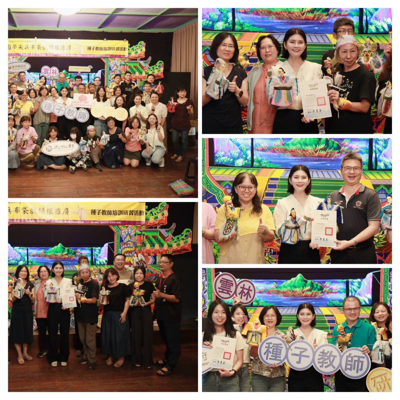 處長陳壁君補充到,今年以文化傳承永續發展、培養在地專業人才、學習語言表達能力與品德教育及促進在地文化產業為期許,規劃階段性教學分享課程,辦理種子教師研習營,涵蓋劇本、口白、操偶、音樂、實作,從多面向的角度認識、理解布袋戲,進而欣賞、享受布袋戲帶來的趣味,並藉由研習營儲備種子教師滋潤的教學養分,灌溉孩子的學習生涯,以達開枝散葉傳承推廣之扎根標的。從雲林故事館的創辦人唐麗芳老師帶來精彩的在地故事,傑出表演團隊太日樂集帶來精彩的後場音樂、黃世志電視木偶劇團、隆興閣掌中劇團、明星園掌中劇團、昇平五洲園、雲林五洲小桃源掌中劇團等優秀藝師,指導教師們分組演出,更有青年女藝師陳淑如帶來道具製作課程,可說是布袋戲精銳盡出。