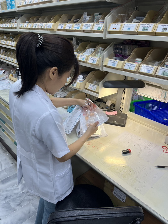 圖說2:藥師依據醫師處方內容,正確撿取藥品、核對藥名與劑量後,進行分裝與裝袋,以備交付。