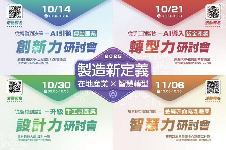金屬中心表示,在全球供應鏈重組、淨零減碳與人才斷層的多重挑戰下,傳統製造唯有加速數據化與即時化決策,才能守住利潤、開拓新市場。而中心啓動的四場《製造新定義|在地產業 × 智慧轉型》系列關鍵研討會活動資訊,誠摯邀請產業先進踴躍報名: