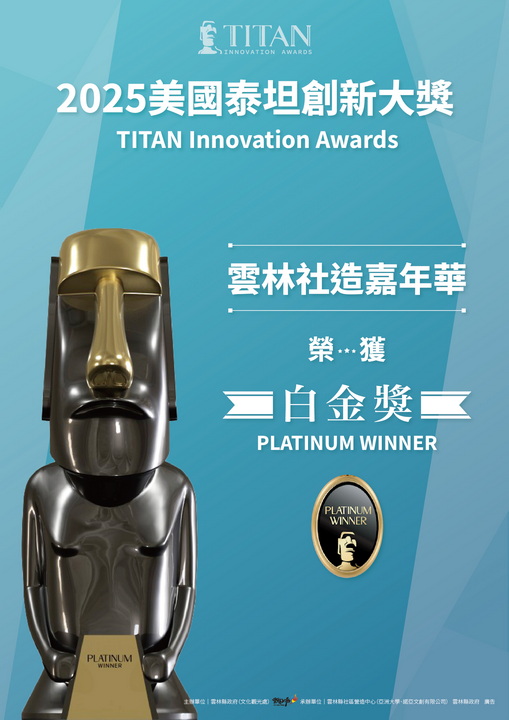 【台灣新聞網記者李婉愉/雲林報導】在國際矚目的 「TITAN Innovation Awards 2025」 評選中,雲林縣政府以「雲林社造嘉年華 Yunlin Community Carnival」榮獲 PLATINUM WINNER(白金獎)最高等級殊榮, 2024「雲林社造嘉年華」以文化創新與地方共創為核心,連續榮獲三項國際肯定,包含:2025法國設計獎French Design Awards—銀獎;2025美國IAA MUSE Creative Awards(文化活動類)—銀獎;2025美國TITAN Innovation Awards(活動創新類)—白金獎,此三座國際大獎的肯定,象徵雲林的文化治理模式獲得國際專業評審的高度認可,並成功以文化行動讓世界看見臺灣地方創生的深厚實力。