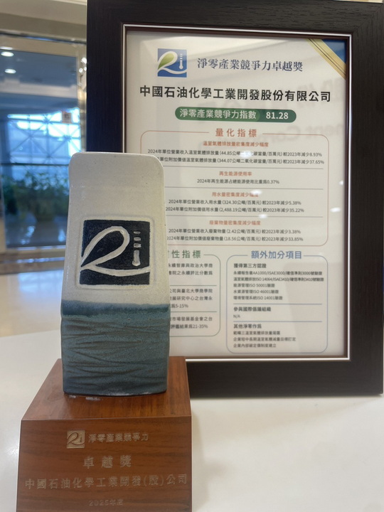 本屆塑化業25家上市櫃公司共有8家企業獲獎,其中卓越獎為70分以上共四名,特優獎60~70分共四名。面對激烈競爭與嚴格評選,中石化公司榮獲淨零產業競爭力指數70分以上的卓越獎榮譽,充分彰顯了中石化公司在自主減碳、邁向淨零碳排方面的努力和顯著成果,並獲得第三方的高度認可。