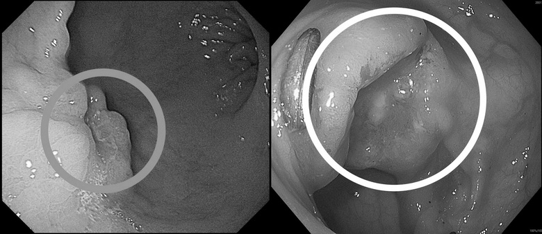 圖說2:病人接受詳細檢查,醫師在其胃部及乙狀結腸內均發現癌灶(圓圈處)。圖/高醫岡山醫院提供