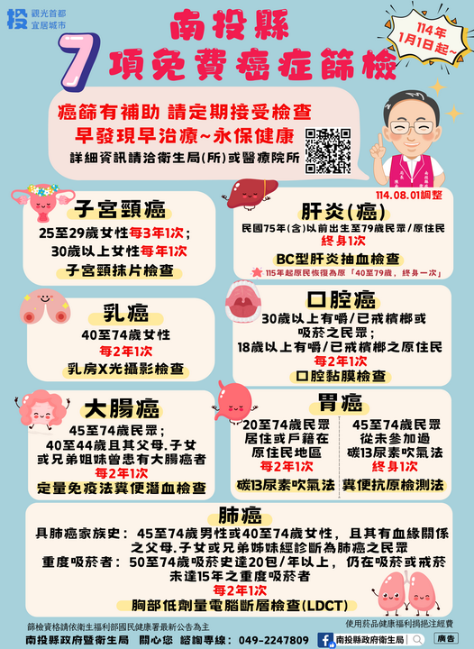 南投縣政府衛生局局長陳南松呼籲,許多民眾因害怕或輕忽而未進一步追蹤,往往錯失治療黃金期。此次補助計畫結合本縣簽約醫療院所,透過主動關懷、轉介與費用補助,鼓勵民眾安心就醫,提升篩檢後追蹤率。他強調:「癌症防治最重要的就是預防與早期發現,別讓恐懼阻礙健康。」,南投縣政府衛生局每月規劃多場癌症篩檢活動,鼓勵符合資格篩檢之民眾,前往醫療院所檢查,一起為健康把關!(南投縣政府衛生局廣告)