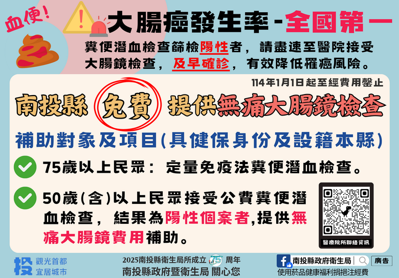 為鼓勵民眾落實後續追蹤,南投縣政府自114年1月1日起加碼推動「癌症篩檢民眾追蹤管理補助計畫」,針對設籍本縣75歲以上長者,提供定量免疫法糞便潛血檢查費用補助及50歲(含)以上公費糞便潛血檢查結果疑似異常者,補助其進一步接受「無痛大腸鏡檢查」所需之麻醉及清腸藥物費用。截至目前,已提供75歲以上長者定量免疫法糞便潛血檢查服務838人;另針對50歲(含)以上民眾,接受公費糞便潛血檢查且結果為陽性者,已有512人完成補助無痛大腸鏡檢查,並成功偵測出37例大腸癌個案,達到早期發現、早期治療的目標。