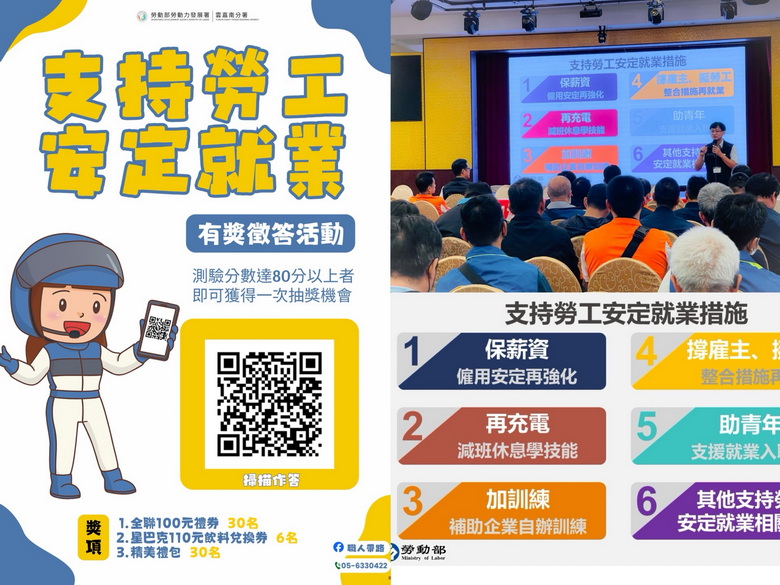 【台灣新聞網記者李婉愉/雲林報導】因應經濟貿易變動,企業在人力運用上更需政府支持,為了協助轄區內各企業代表迅速掌握勞動部所推出的各項「支持勞工安定就業措施」,穩定勞雇關係,勞動力發展署雲嘉南分署虎尾就業中心特別於 11 月 1日至 11 月 10 日期間,舉辦線上「政策小學堂趣味互動測驗」活動,以輕鬆有趣的方式,讓企業夥伴在短時間內了解相關補助資源;截至目前短短幾天,活動已獲得上百家企業響應,反應相當熱烈。