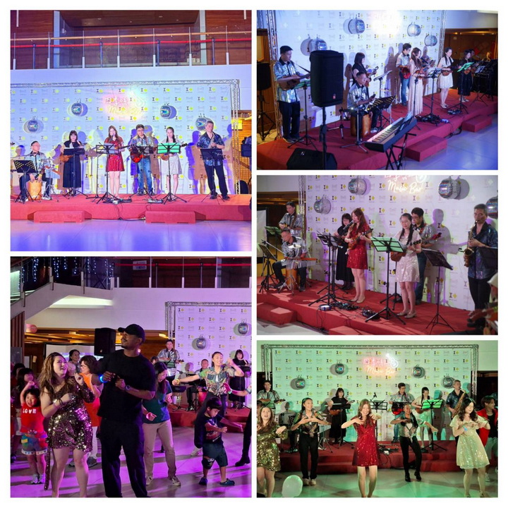 【台灣新聞網記者李華庭/嘉市報導】四季‧紅烏克麗麗樂團年度壓軸售票音樂會11月15日晚間於嘉義市政府文化局音樂廳大廳盛大登場,今年邁入第三年的售票音樂會,更首度以「四季‧紅MusicBar微醺舞動音樂派對」為主題,將文化局音樂廳大廳打造成絢麗繽紛的Disco舞池。現場民眾熱情陶醉、隨節奏盡情舞動,沉浸在宛如回到90年代Pub的熱鬧氛圍,嗨翻一整晚。