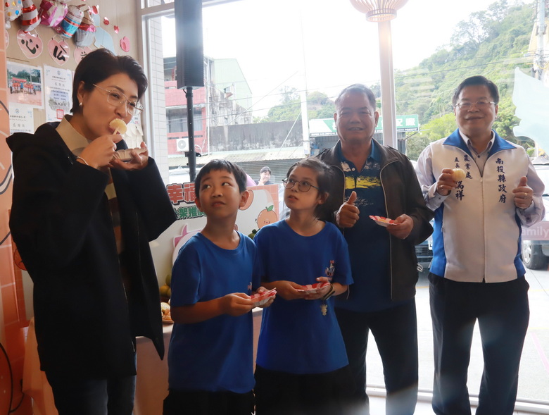 圖說:品味南投攜手全家便利商店,首推中寮袋裝柑橘香甜上市;南投縣長許淑華(左)大啖當季柑橘,南投縣政府農業處長蘇瑞祥(右)與中寮鄉長廖宜賢(右二)共同來讚聲。