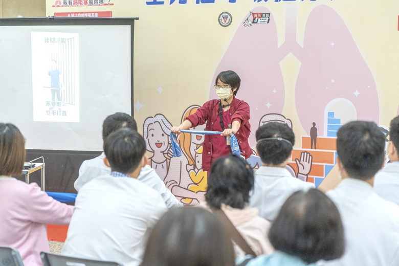圖說4:高醫慢性阻塞性肺病團隊帶領病友與民眾進行毛巾伸展操,以實作方式學習正確的呼吸與日常保健。