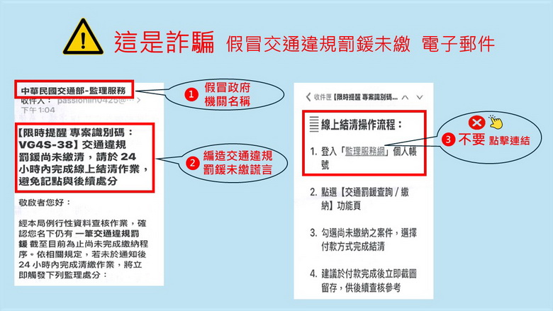 【台灣新聞網記者張美惠/高雄報導】詐騙集團經常以電子郵件(E-mail)假冒「交通違規罰鍰未繳」通知,引誘民眾點擊連結繳費,進而竊取信用卡及金融帳戶資料,造成財產損失。高雄區監理所強調,「交通違規罰鍰不會以電子郵件方式通知繳納」,凡收到交通違規罰鍰未繳電子郵件,一律為詐騙訊息,請勿點擊任何連結,以免落入詐騙陷阱。