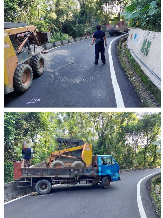 陳員隨即通報派出所同仁林峻賢警員到場協助,並先行設置三角錐暫時封閉道路、確保安全。兩人合力指引貨車司機黃姓男子將車上小型推土機卸下,並駛往較為平緩的道路位置,順利排除受困情形。在員警協助下,黃男對警方積極的協助表達感謝。
