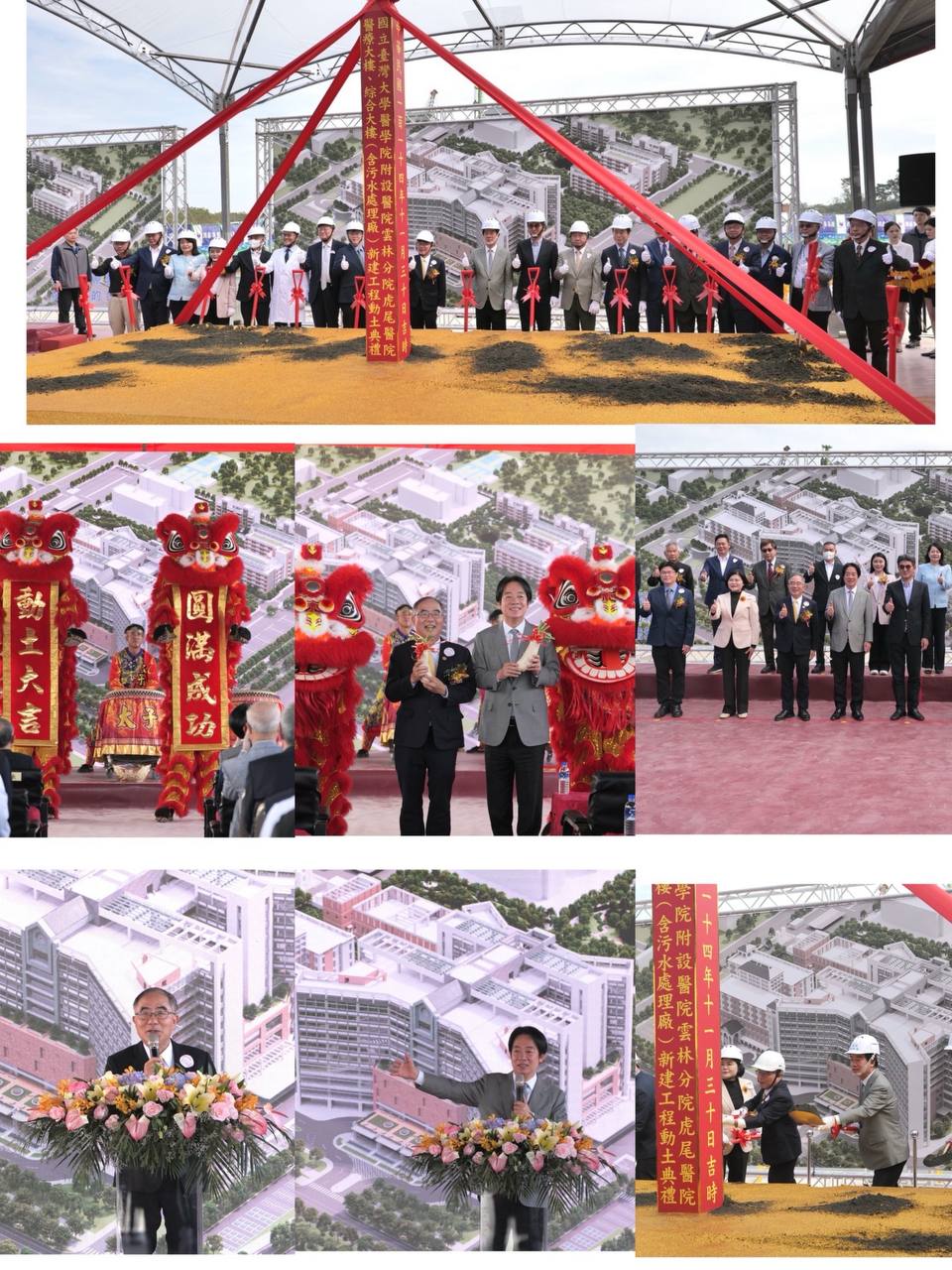 今日動土典禮由賴清德總統親臨主典,立法委員劉建國、立法委員丁學忠、立法委員張嘉郡、立法委員許宇甄、行政院陳時中政務委員、監察委員林郁容、教育部朱俊彰常務次長、雲林縣張麗善縣長、雲林縣議會黃凱議長、臺灣大學陳文章校長率體系主管,包括張上淳副校長、臺大醫學院賴逸儒副院長、臺大醫院余忠仁院長、臺大醫院雲林分院馬惠明院長、另輔大醫院黃瑞仁院長、中興工程顧問股份有限公司陳伸賢董事長、俊彥建築師、劉培森建築師、潤弘精密工程事業股份有限公司李志宏董事長與地方士紳等貴賓皆共襄盛舉,共同進行祝禱祈福與動土儀式,期盼工程順利、興建圓滿。