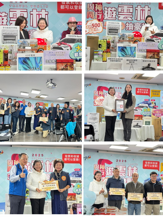 雲林縣政府文化觀光處副處長陳世訓表示,恭喜今日抽獎各得獎者,也邀請民眾繼續遊賞雲林,接下來的活動有:跨年晚會12月31日於雲林縣立田徑場盛大登場,114/12/16-115/03/31糖都嘉年華已熱絡登場,2026新春活動一路玩到元宵節小過年系列活動,以及115/02/14-03/08的2026北港燈會也將開跑,還有雲東地區的古坑草嶺櫻花季115/02/17-03/01等主題式活動,歡迎全國遊客規劃一或二日遊來雲林深度踏訪,慢遊感受雲林美景及體認五感的森林療癒及觀光住宿、消費,感受雲林滿滿熱情。