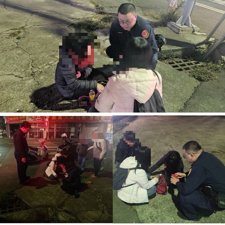 【台灣新聞網記者李婉愉/雲林報導】斗南分局斗南新崙所所長邱柏源及警員連威凱執行夜間巡邏勤務時,在斗南鎮文昌路及大同路口發現有兩名女子蹲坐在地上,其中一女子面露難色,另一名頭戴安全帽的女子陪伴在側。員警見狀主動上前關心兩名女子,經詢問,發現面有難色的女子是來台旅遊的日籍旅客,另一名女子是剛好騎機車經過的熱心民眾,見其蹲坐在路旁上前關心。