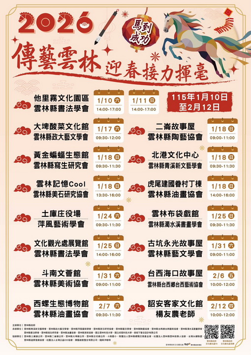 雲林縣政府文觀處指出,「傳藝雲林」迎春接力揮毫活動結合傳統年節習俗,推廣書畫文化,並特別串聯文化館舍來舉辦,讓民眾自然親近文化場域,是年節前夕最應景的藝文活動,每年吸引民眾熱烈參與。今年縣府持續舉辦,場次更高達16場,邀請縣內12個藝文團體,包含雲林縣美術協會、雲林縣台西鄉台西藝術協會、雲林縣萍風藝術學會、雲林縣油畫協會、雲林縣政大藝文學會、雲林縣陶藝協會、雲林縣青溪新文藝學會、雲林縣濁水溪書畫學會、雲林縣美石研究協會、雲林縣寫生研究會、雲林縣書法學會、雲林縣藝文學會等,超過70位知名書法家與藝術家參與,以輪流接力的方式,在各具特色的文化館舍揮毫寫春聯、繪製年畫,免費贈送給來訪民眾。
