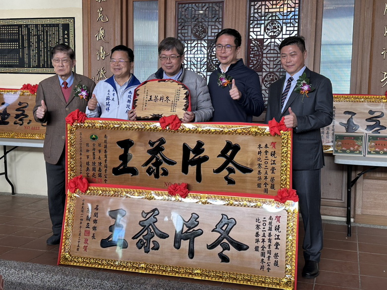 圖說:南投縣茶商業同業公會主辦的「114年冬季暨全國冬片茶比賽茶」特等茶王開罐儀式合影。(記者李汶融攝)