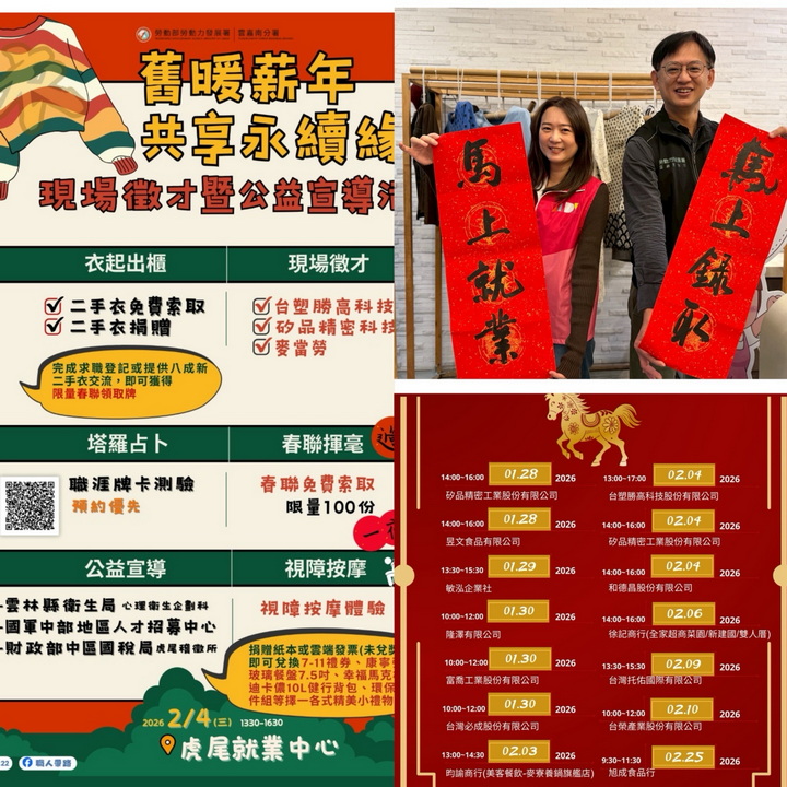 【台灣新聞網記者李婉愉/雲林報導】為協助民眾在農曆春節來臨前把握就業契機,並推廣公益關懷與永續理念,勞動部勞動力發展署雲嘉南分署虎尾就業中心將於2月4日下午辦理「衣舊暖薪年.共享永續緣」現場徵才暨公益宣導活動;活動以「找工作、做公益、學永續」為主軸,結合企業徵才、政府資源宣導與多元體驗服務,打造兼具實用性與趣味性的就業服務場域,期盼透過輕鬆親民的方式,吸引更多民眾走進就業中心,認識政府資源、掌握就業機會,同時實踐環保與共享精神,讓求職不只是找工作,更是一次溫暖的社會連結。