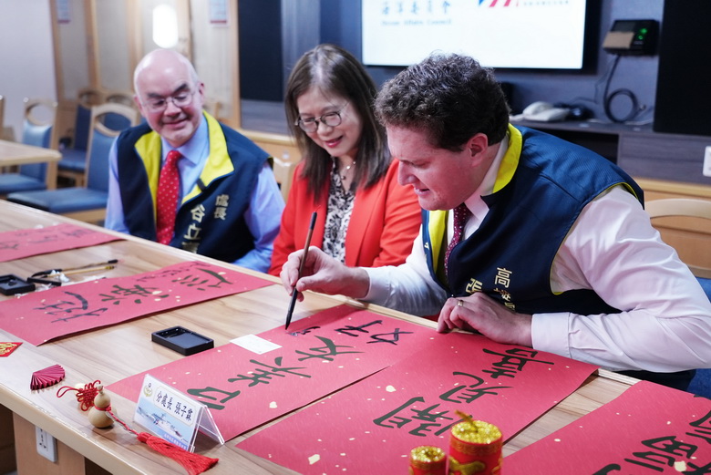 圖說:管碧玲主委邀請谷立言處長、AIT高雄分處張子霖分處長一同在雲林艦上揮毫,體驗台灣春節文化,並親手包水餃與艦上同仁分享。