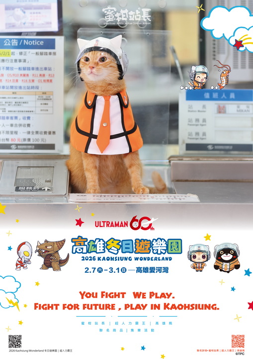 為迎接2026冬季旅遊熱潮與春節連假,高雄市今年冬日遊樂園以「超人力霸王」為主題 IP,將於愛河灣及高雄港16-18號碼頭盛大登場,Q版超人力霸王與怪獸FRP也出現在捷運美麗島站讓民眾捕捉拍照,而可愛的「蜜柑站長」與高雄熊則於本周壓軸登場,穿上超人力霸王科學特殊搜查隊造型與大家見面,想要見到萌萌蜜柑換裝秀的粉絲,可於大年初二前往橋頭糖廠站觀看蜜柑值勤。期間限定的彩繪輕軌列車「虎遊岡山號」行駛至2月23日,「冬日遊樂園」號行駛至3月1日,「萌虎平安號」行駛至4月30日止,歡迎民眾上高雄捷運APP或官網查詢列車動態,在搭乘輕軌暢遊高雄的同時,也能近距離感受各式文化交流的可愛魅力。