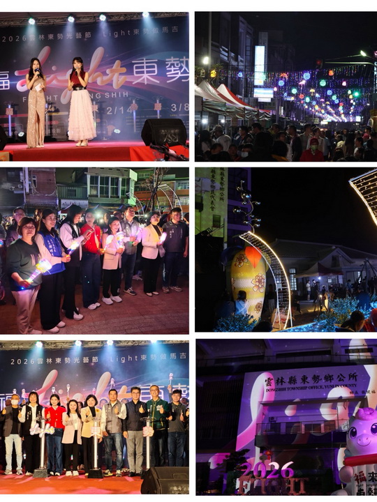 雲林縣長張麗善表示,農曆過年及元宵節將至,雲林縣好多處漂亮絢麗的燈區逐一點亮,有斗六太平老街、虎尾同心公園、西螺福興宮,到燈會原鄉北港燈會的六大燈區十大主題等等。而東勢鄉公所今年第一次舉辦的光藝節也在今晚隆重啟燈登場,燈會期間自今天開始一直到3月8日,東勢鄉公所、賜安宮及周邊道路,全都打造充滿節慶的光影廊道,增添濃濃的年味。