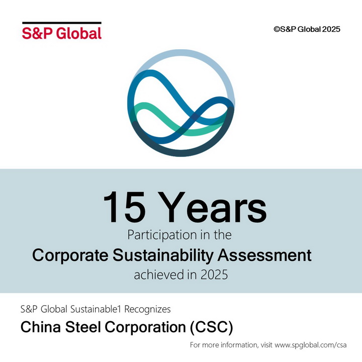 S&P Global為全球最具影響力之金融資訊提供與信用評級機構之一,2026年S&P Global依據2025年CSA成績,從全球超過9,200家企業中,選出848家企業列入標普全球永續年鑑會員,並依其分數在產業排名高低給予不同層級的肯定,中鋼在2025年競爭激烈的評比中再次脫穎而出,CSA成績名列全球鋼鐵業第二名,取得Top 5%的佳績。
