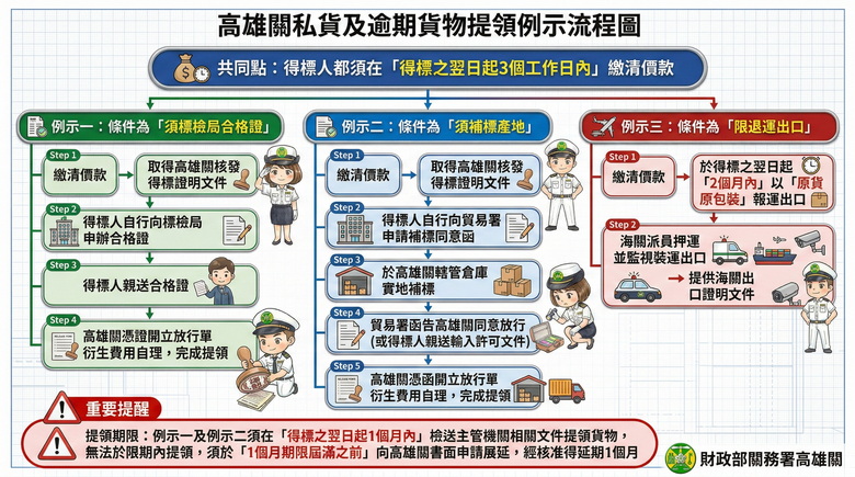 高雄關表示,本次部分標售貨物若屬須經濟部標準檢驗局合格證或須補標產地後取得經濟部國際貿易署同意進口者,得標人在得標之翌日起3個工作日內繳清價款後,向上開主管機關遞件申請合格證或補標產地完成後取得貿易署同意進口文件,始可提領得標貨物;若標售貨物屬限退運出口者,得標人須於得標之翌日起2個月內在海關監視押運下以原貨原包裝報運出口。
