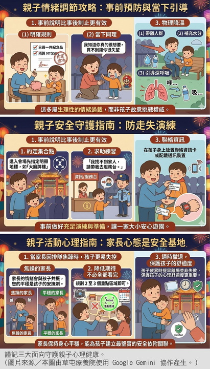 謹記三大面向守護親子心理健康。1.情緒調節:事前說明比事後制止更有效 (1)明確規則:出發前即約定好是否購買紀念品、預算上限或數量。
