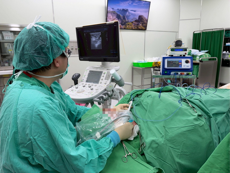 圖說:高醫岡山醫院耳鼻喉頭頸外科黃子晏主任,於超音波導引下進行甲狀腺消融治療,以微創方式精準處理良性結節,降低手術風險並提升恢復品質。