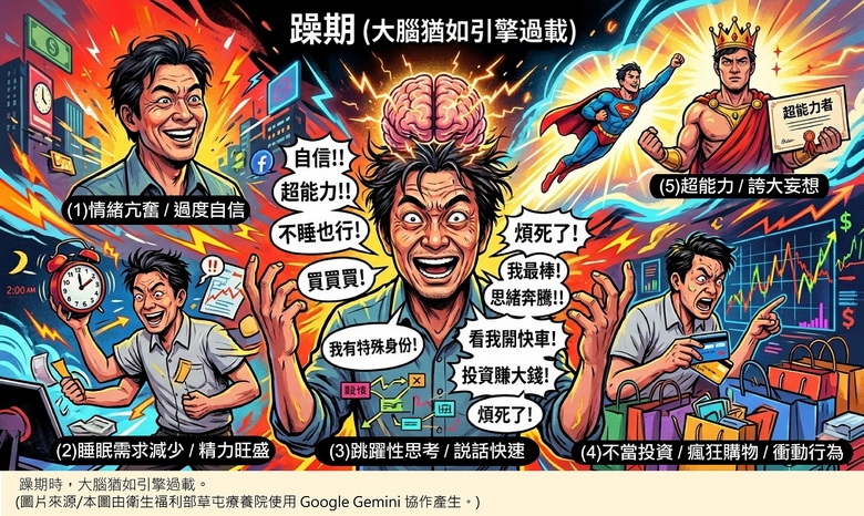 躁期(情緒異常高昂或易怒):當患者處於躁期時,大腦猶如引擎過載