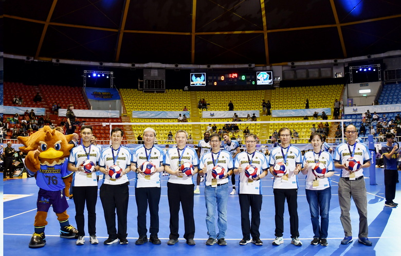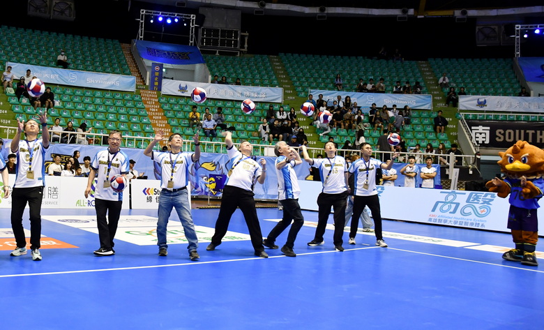 開球儀式氣勢磅礡,由高醫體系大家長—財團法人私立高雄醫學大學董事會陳建志董事長領軍,率領高雄醫學大學余明隆校長、林志隆副校長、周汎澔副校長、黃友利副校長,以及高醫大附設中和紀念醫院戴嘉言副院長、高醫大附設高醫岡山醫院黃炫廸院長、高雄市立小港醫院洪志興院長,與高雄市立旗津醫院楊禮嘉醫務秘書共同出席。儀式設計別具巧思,由陳建志董事長率先傳球給校院首長,隨後全體首長齊力發球,象徵在董事會卓越領導下,高醫校院緊密協作,將醫療專業轉化為運動員最堅實的防護網,也為賽事揭開熱血序幕。