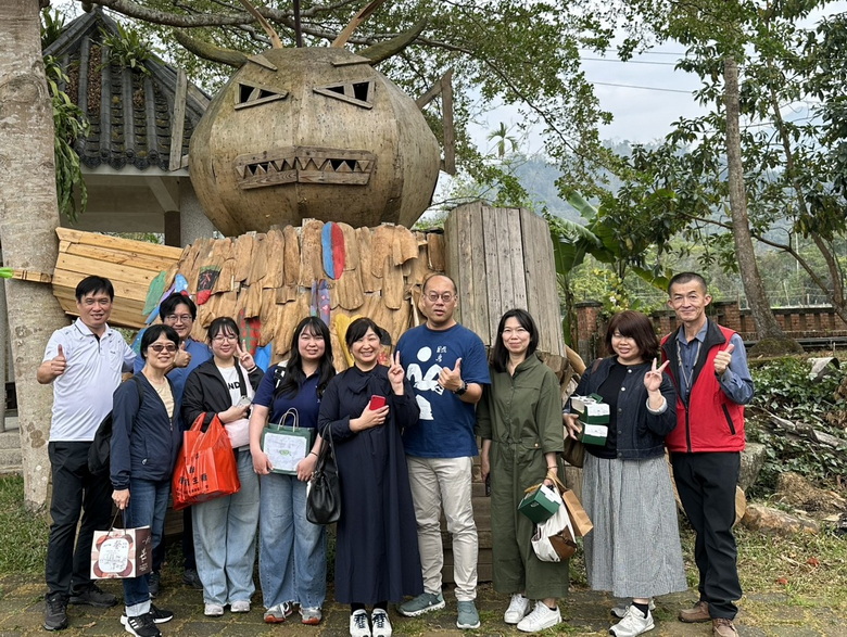 圖說2:鹿谷鄉秀峰國民小學校長陳俊豪帶領來賓於師生共創的校園神獸前合影。(記者李汶融攝)