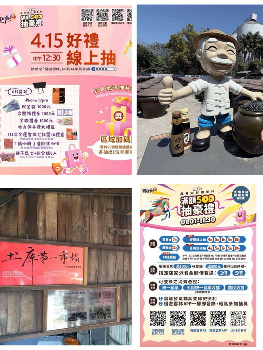 此外,「2026與神同行遊雲林滿額500抽好禮」活動自即日起至11月30日持續辦理,民眾於縣內消費累計每滿500元即可獲得1組抽獎序號,累積越多,中獎機會越高。透過階段性、多節點的抽獎規劃,不僅延長活動熱度,也有效帶動消費循環。首場「線上抽好禮」將於4月15日登場,獎項包含iPhone手機、現金獎、通路禮券及雲林特色伴手禮等,內容豐富多元。