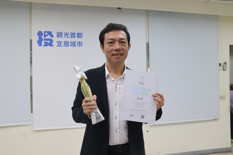 圖說1:南投縣政府新聞及行政處長蔡明志展示 2026 年美國謬思創意大獎白金獎的獎狀及獎碑。