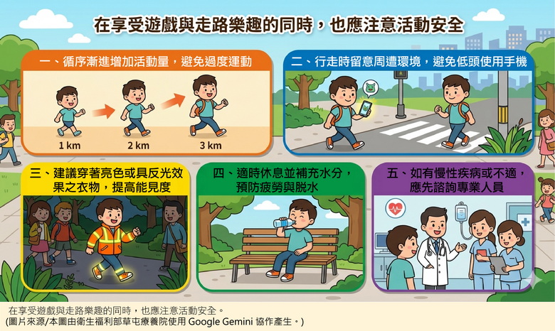此外,在享受遊戲與走路樂趣的同時,也應注意活動安全:一、循序漸進增加活動量,避免過度運動。二、行走時留意周遭環境,避免低頭使用手機。三、建議穿著亮色或具反光效果之衣物,提高能見度。四、適時休息並補充水分,預防疲勞與脫水。五、如有慢性疾病或不適,應先諮詢專業人員。