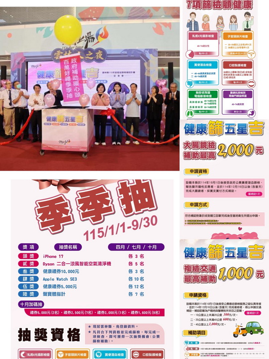曾春美說,本(115)年凡符合健康篩檢資格者(檢查項目:子宮頸抹片、乳房X光攝影、口腔黏膜、糞便潛血、胃幽門螺旋桿菌、胸部低劑量電腦斷層及B、C型肝炎篩檢含成人健康檢查)將近60萬人次,為吸引民眾參與,我們特別編列100萬元抽獎活動預算,只要有一項完成篩檢即可參與總價值100萬元的抽獎活動,分別於4月、7月及10月抽出。