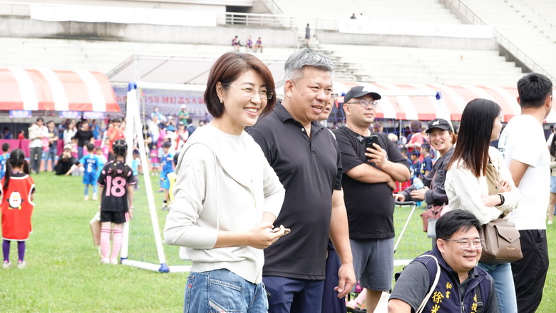 圖說1:南投縣長許淑華(左)出席南投縣璉紅盃5人制幼兒足球錦標賽,在縣府同仁簡明標(右)帶領下,於場邊欣賞比賽。(記者李華峻攝)